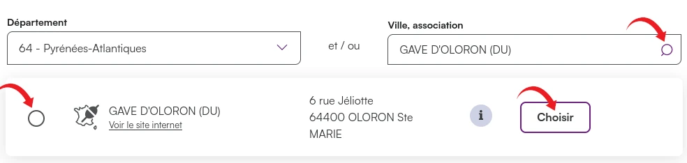 Une fois redirigé sur le site cartedepeche.fr, Renseignez les champs « Département » et « Ville association » puis cliquez sur la petite loupe, pour choisir notre aappma